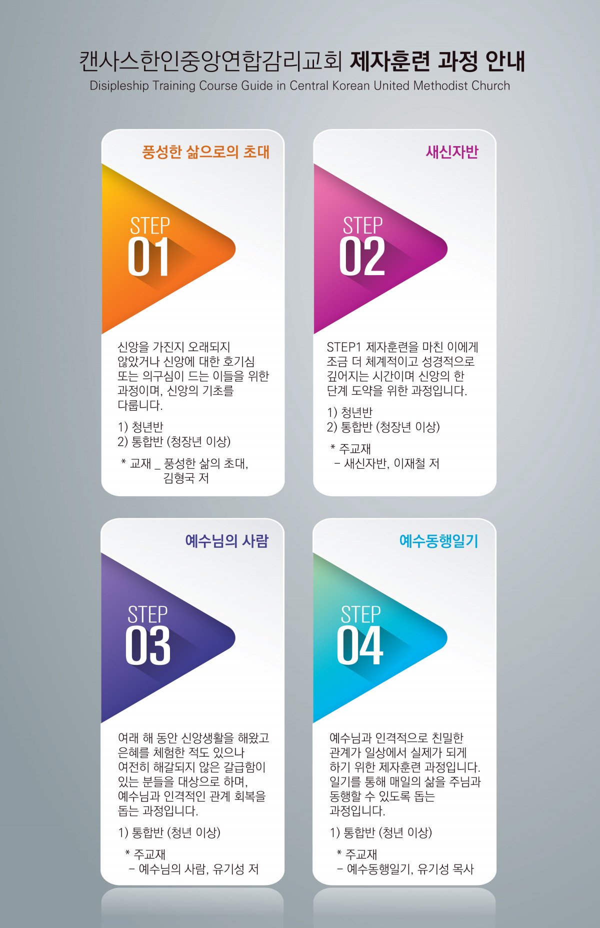 제자훈련 과정 안내 Discipleship Process예수동행일기 Journal with Jesus교인등록 Membership Registration세례식 Baptism새가족환영회 Newcomers Reception말씀 묵상 (Quiet Time)교회 섬김 Serving the Church